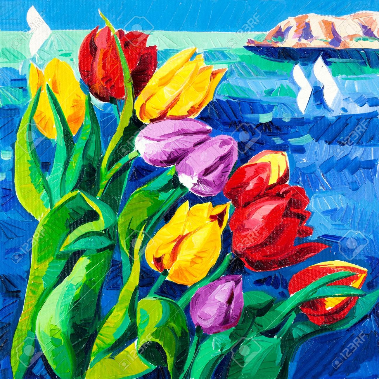 Original Oil Painting Of Beautiful Tulips Tulipa In Front Of Ocean On Canvas Modern Impressionism Stock Photo Picture And Royalty Free Image Image 15209759