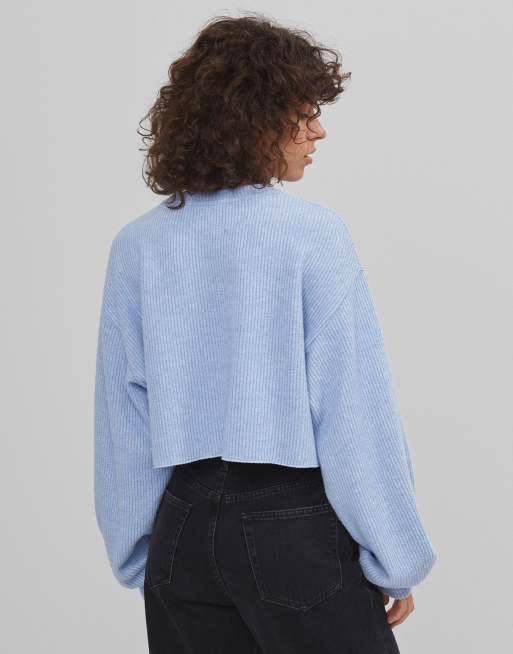 Bershka Soft Touch Ribbed Cropped Sweater In Light Blue Asos